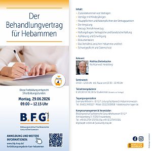 Rechtsanwalt Matthias Diefenbacher wird am 29.06.2026 einen Online-Vortrag zum Thema "Der Behandlungsvertrag für Hebammen" beim B.F.G. (Bildungsinstitut Fachbereiche Gesundheitswesen) halten. Zur Anmeldung geht es ...hier!